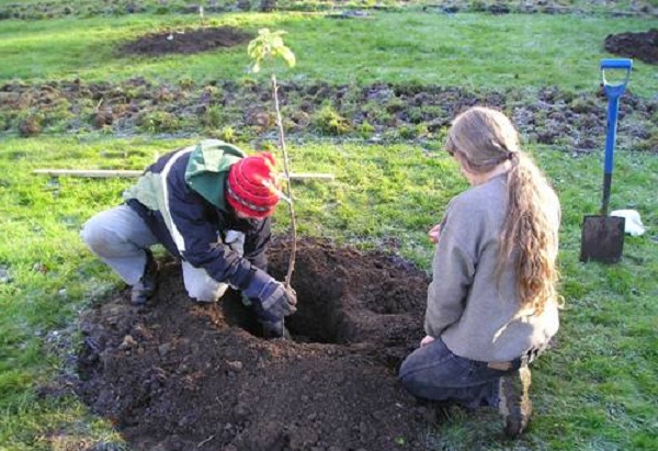 Sadzonkę umieszcza się w dołku, a jej korzenie prostuje się poziomo i opryskuje na przemian, zaczynając od najniższej i stopniowo przesuwając się w górę. Odległość od najwyższych korzeni do poziomu gleby nie powinna przekraczać 6-7 cm Po posadzeniu podłoże jest ubijane i podlewane.