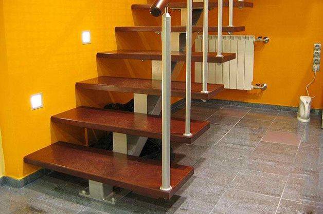 - Jeśli marsz do piwnicy jest mocowany za pomocą śrub od strony ściany, to poręcz podtrzymująca działa jako podpora, a stopień wiąże się ze sobą. Do takiej konstrukcji stosuje się płytę o grubości 50-60 mm. Główna poręcz jest utrzymywana na miejscu za pomocą słupków poręczy.
