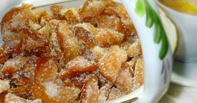 - Dalsze kroki całkowicie powtarzają przepis na robienie owoców kandyzowanych z gruszek do wyboru: w piekarniku lub w suszarce elektrycznej.