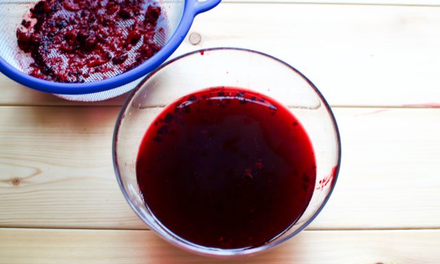 - Po ugotowaniu sok z jagód oddzielony w pierwszym etapie wlewa się do masy. Następnie płyn jest ponownie filtrowany, pozbywając się ciasta.