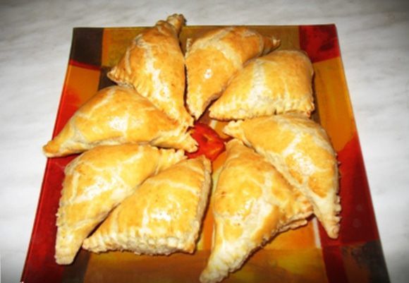 - Umieść wypełnienie pośrodku trójkątów. Następnie są składane na pół i zapinane na krawędziach.