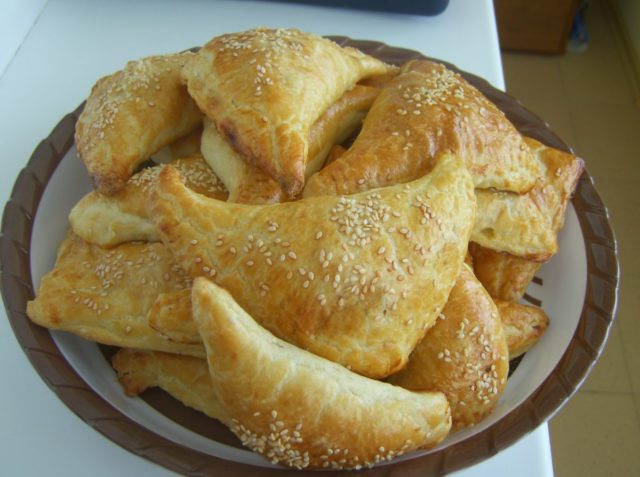 - Z ciasta wyrabia się placki z dodatkiem powstałego nadzienia.