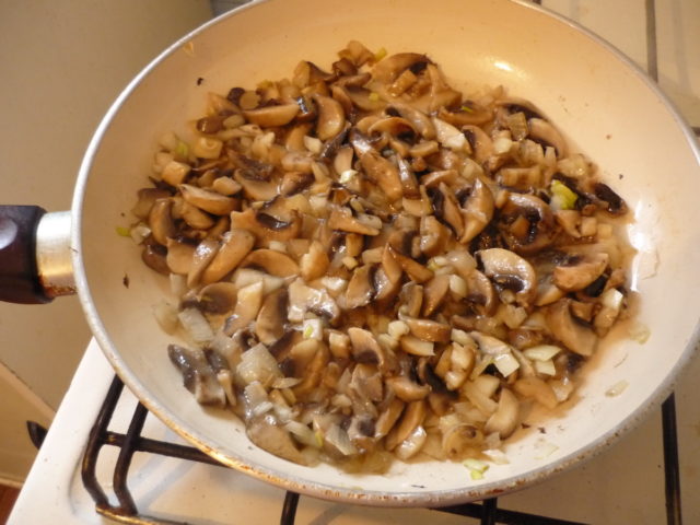 - Pieczarki pokroić w małe plasterki i smażyć na patelni z cebulą przez siedem minut.