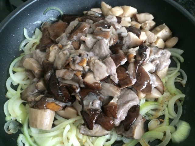- Grzyby pokrojone na małe kawałki smażymy z cebulą do czasu ugotowania.