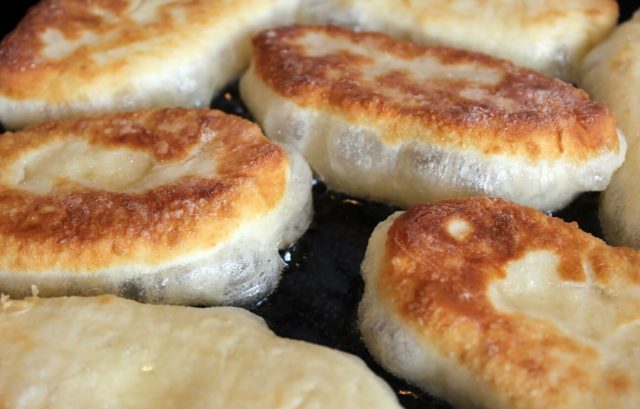 - Z małych kawałków ciasta powstają ciasta, które będą podstawą do ciast. W nich zawinięte jest wypełnienie. Smaż produkty przez pięć minut z każdej strony.