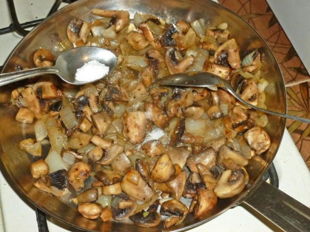 - Cebule i grzyby są siekane i wysyłane na patelnię. Smażyć składniki na maśle. Kilka minut przed gotowością dodaj do nadzienia kilka łyżek kwaśnej śmietany i soli.