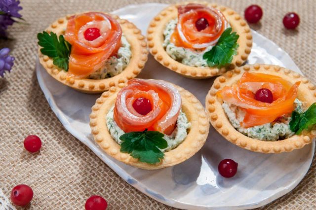 Gotowanie nie zajmuje dużo czasu, jeśli jadalne filiżanki są przygotowane z wyprzedzeniem. Zastępując śledzia inną rybą, można dostać tartaletki z łososiem, awokado i twarogiem. Będziesz potrzebował następujących składników: